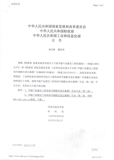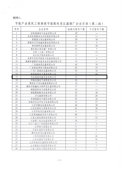 近日,國(guó)家發(fā)改委、財(cái)政部、工信部正式公布《節(jié)能產(chǎn)品惠民工程高效節(jié)能配電變壓器推廣企業(yè)目錄(第二批)》(http://www.ndrc.gov.cn/zcfb/zcfbgg/2013gg/W020130524556402255141.pdf ) ,我公司生產(chǎn)的節(jié)能配電變壓器成功入圍名單之列。